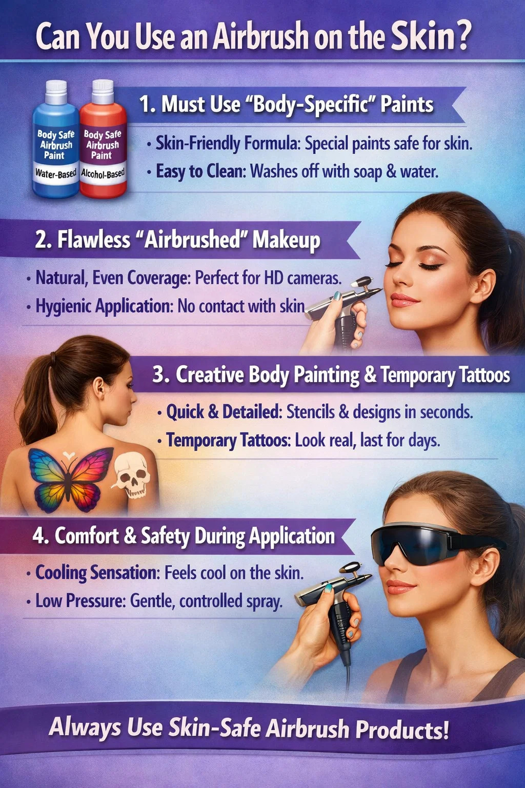 Att använda en airbrush på huden uppnår inte bara en detaljnivå oöverträffad med handapplicering, utan skapar också otroligt realistiska visuella effekter. Men eftersom huden är en del av människokroppen finns det några mycket viktiga överväganden: