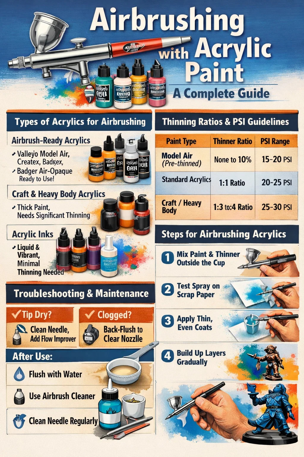 Akryl torkar till en plastliknande film som är vattentät när den härdat. Detta gör rengöring av airbrushen omedelbart efter användning icke förhandlingsbart.