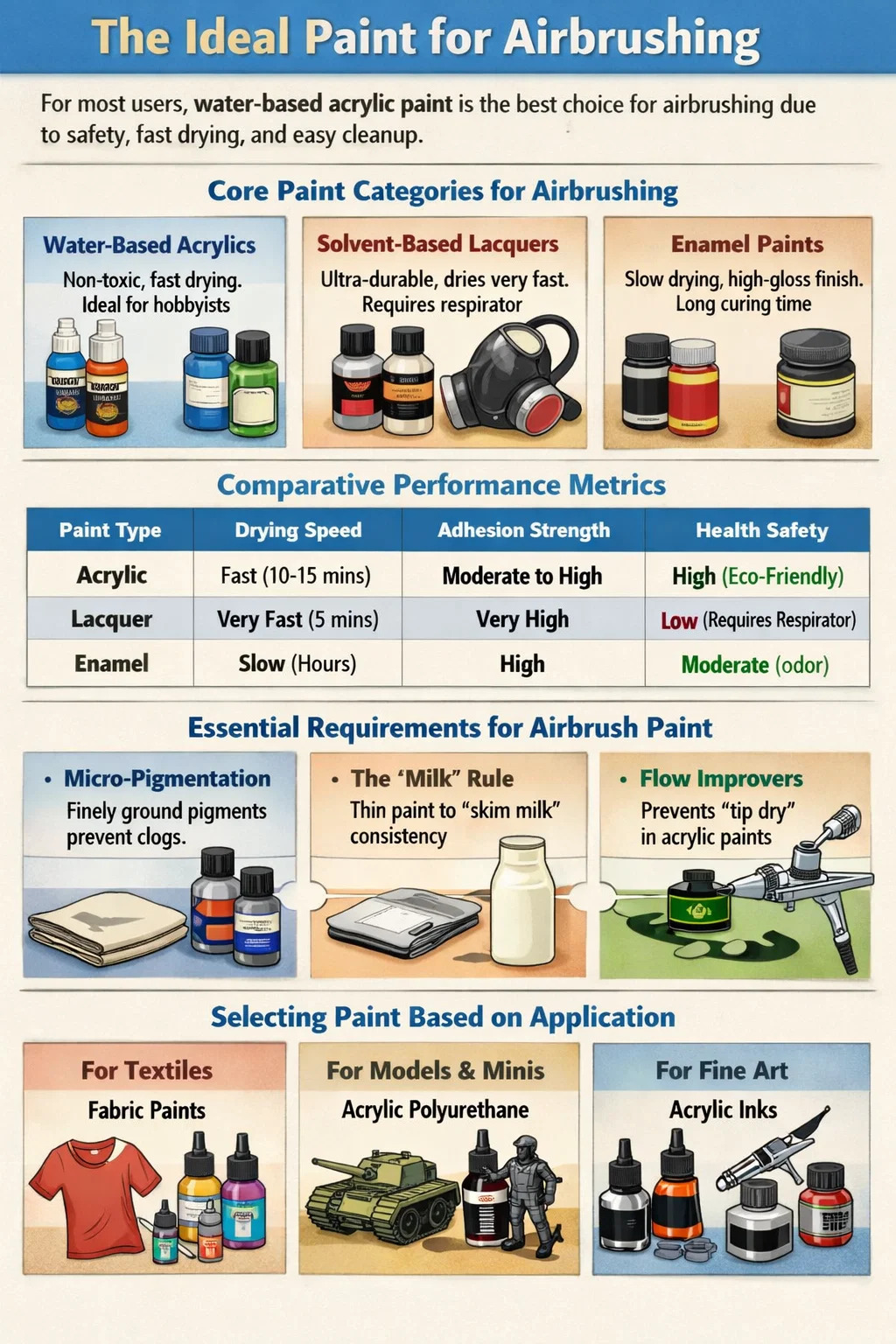För de allra flesta användare, vattenbaserad akrylfärg är det bästa valet för airbrushing. Det ger en optimal balans av giftfri säkerhet, snabba torktider och enkel rengöring med enkelt vatten eller specialiserade rengöringsmedel. Även om avancerade hobbyister kan använda lack för extrem hållbarhet, akryl är industristandarden för allmän illustration, skalenlig modellering och textilarbete på grund av deras mångsidighet över olika ytor och minimal kemisk lukt.